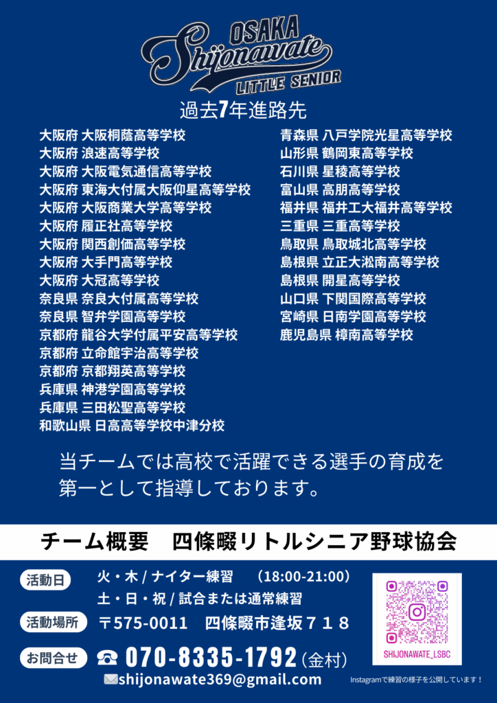大阪府四條畷市逢阪にグランドがあり四條畷中心に活動している中学硬式野球チームです。
